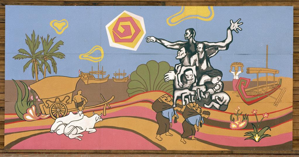 De bovenstaande muurschildering is gemaakt door Basuki Resobowo. Hij was verkiesbaar voor de Indonesische communistische partij (PKI). Door toedoen van Soeharto kwam hij in een communistisch vluchtelingenkamp in China terecht. Zeven jaar later wist hij via Duitsland Nederland te bereiken. Op 5 mei 1983 onthulde Resobowo de muurschildering.